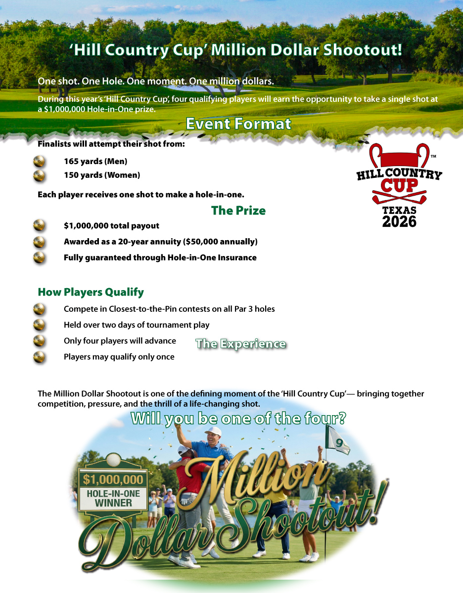 Our annual 'Hill Country Cup' golf tournament is dedicated to bringing together golf enthusiasts of all skill levels from near and far for four days of friendly competition, camaraderie, and fundraising for charitable causes. It's a celebration of the sport behind the backdrop of the stunning Hill Country landscape so all can experience the beauty of our region. Our mission is to produce an unforgettable event, meet new friends and create memorable experiences for all participants.